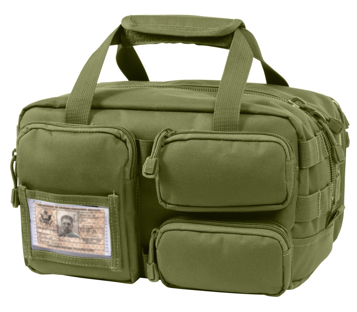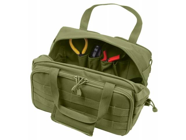 # 9775 - Rothco Inc. Bolso táctico reforzado para herramientas Medidas 28,6 x 20,3 x 17,2 cms. Con un amplio bolsillo externo con cremallera, una ventana de identificación en la parte frontal , una práctica asa de transporte, la bolsa de herramientas táctica es ideal tanto para profesionales como para aficionados. Disponible en tres colores de combate: Negro, Vere Oliva y Marrón Coyote. Elija el suyo.